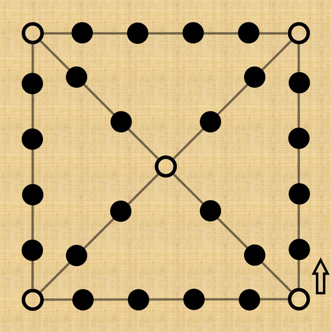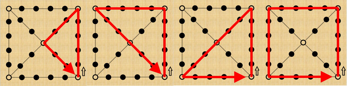 빈 원으로 표시된 위치에 말이 놓이면 상대적으로 짧은 길로 가야한다. 그 위치에 놓이지 않는다면 상대적으로 먼 길로 가야 한다.