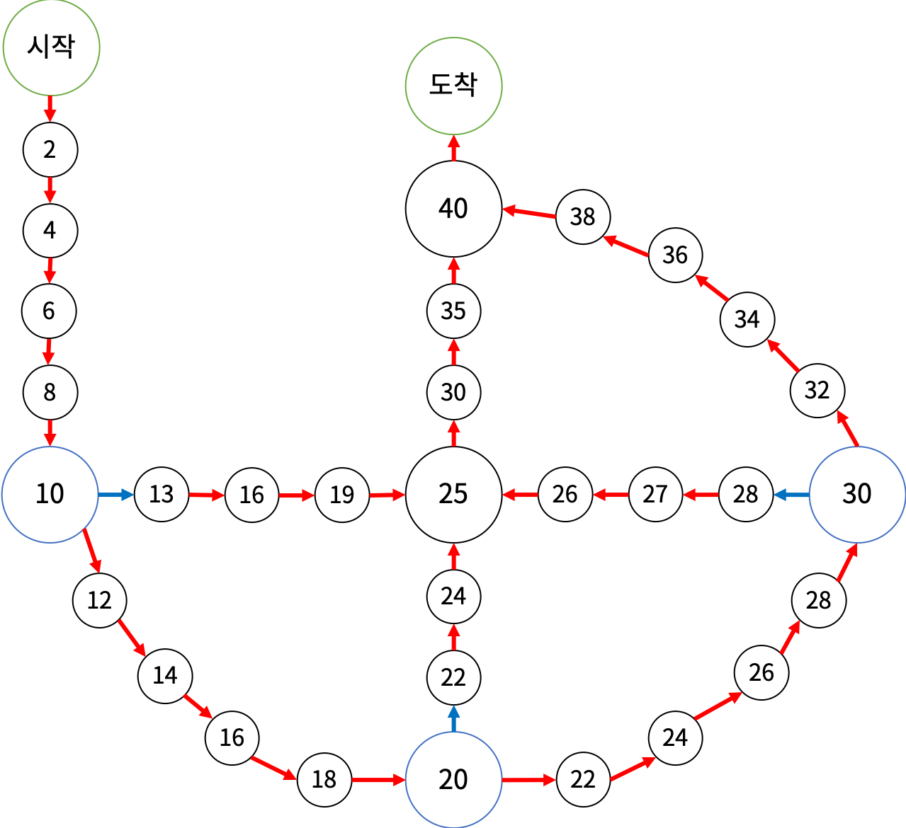 - 외각을 도는 경로를 0번째 route, 첫 번째 파란 화살표를 타고가는 경로를 1번째 route, 두 번째 파란 화살표를 타고 가는 경로를 2번째 route, 세 번째 파란 화살표를 타고 가는 경로를 3번째 route로 정의하였다.