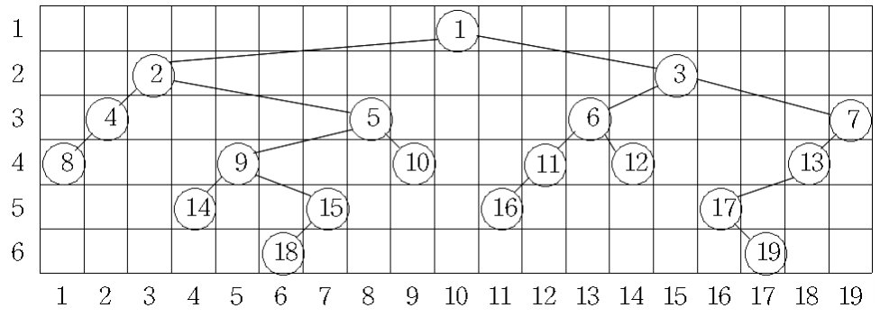 이진트리를 다음의 규칙에 따라 행과 열에 번호가 붙어있는 격자 모양의 틀 속에 그리려고 한다. 이때 다음의 규칙에 따라 그리려고 한다.