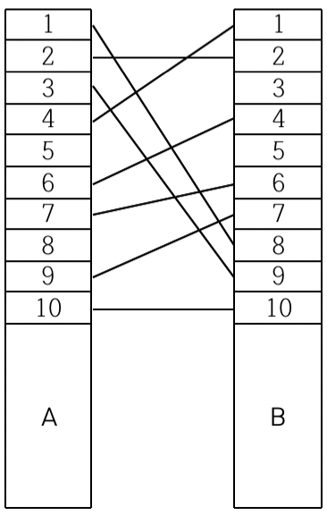 예를 들어, < 그림 1 >과 같이 전깃줄이 연결되어 있는 경우 A의 1번 위치와 B의 8번 위치를 잇는 전깃줄, A의 3번 위치와 B의 9번 위치를 잇는 전깃줄, A의 4번 위치와 B의 1번 위치를 잇는 전깃줄을 없애면 남아있는 모든 전깃줄이 서로 교차하지 않게 된다.