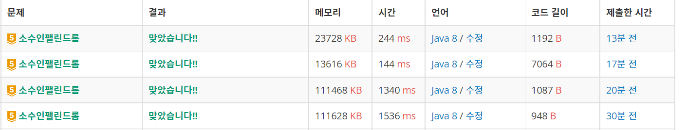 - 1. 개선: '자리수가 짝수이면서 팰린드롬이면 소수가 아니다'는 관찰을 이용, b가 천만이 넘으면 천만까지만 소수를 구한다.